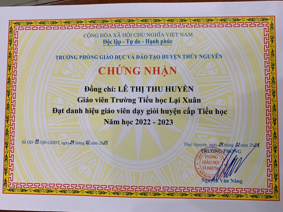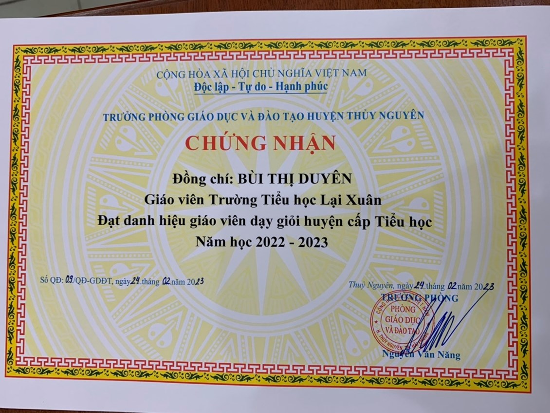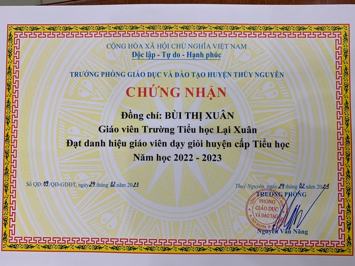 Thực hiện kế hoạch năm học của Phòng Giáo dục và đào tạo huyện Thuỷ Nguyên năm học 2022-2023 Phòng Giáo dục tổ chức cuộc thi giáo viên dạy giỏi cấp huyện. Đây là một đợt sinh hoạt chuyên môn sâu rộng của huyện nhằm giao lưu giữa các trường tiểu học trong huyện. Trường Tiểu học Lại Xuân lựa chọn 7 đồng chí tham dự đợt sinh hoạt chuyên môn này. Trải qua hai phần thi Báo cáo biện pháp nâng cao chất lượng giáo dục và thực hành tiết dạy. Kết quả 7/7 đồng chí được công nhận là giáo viên dạy giỏi cấp huyện.