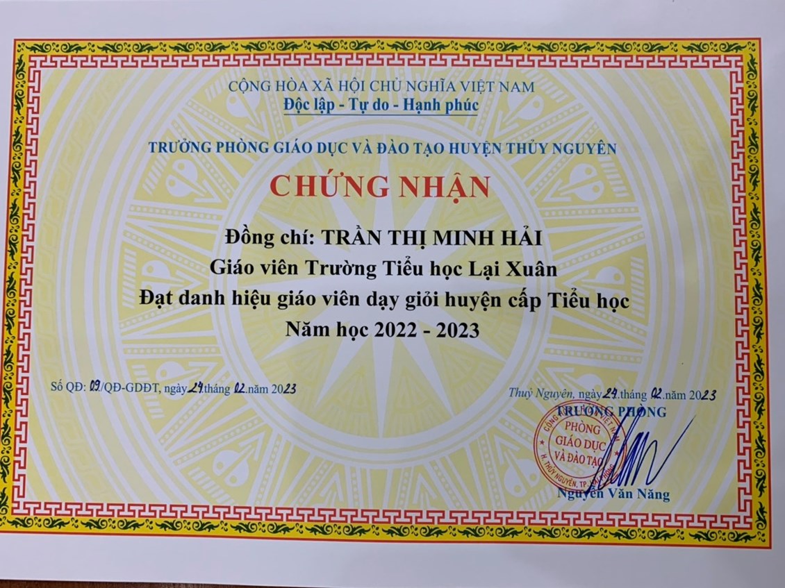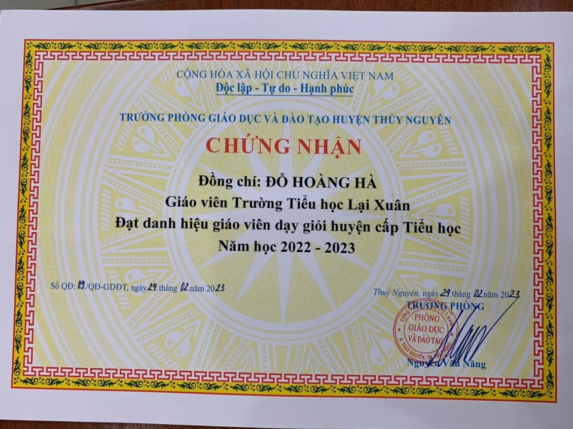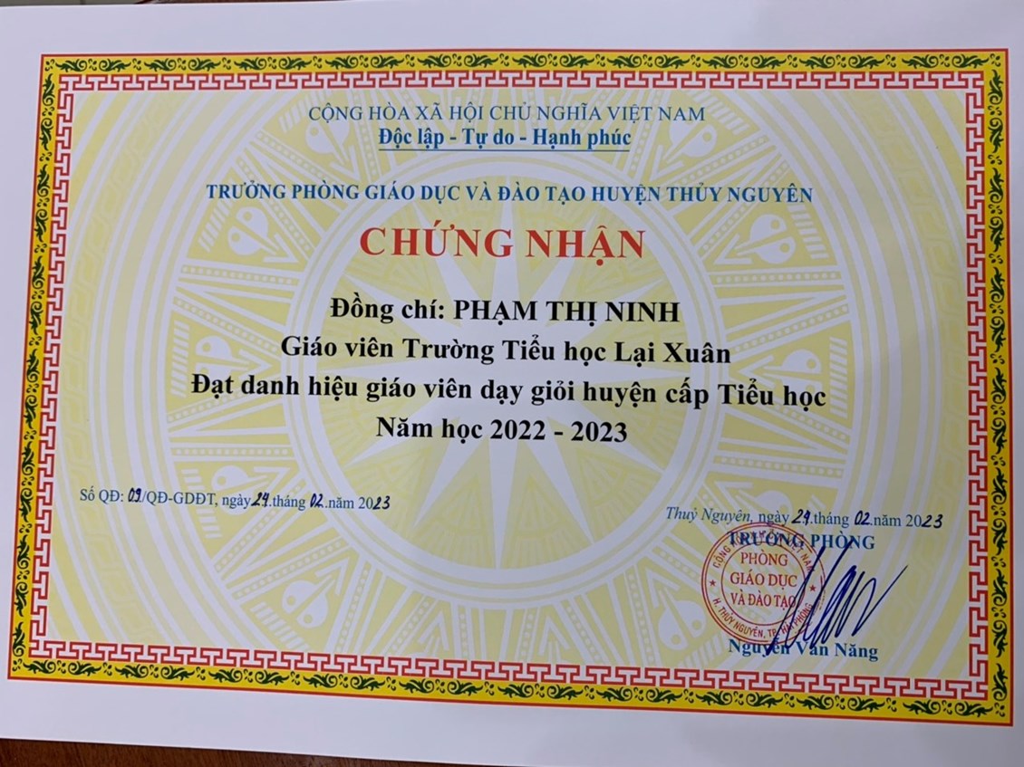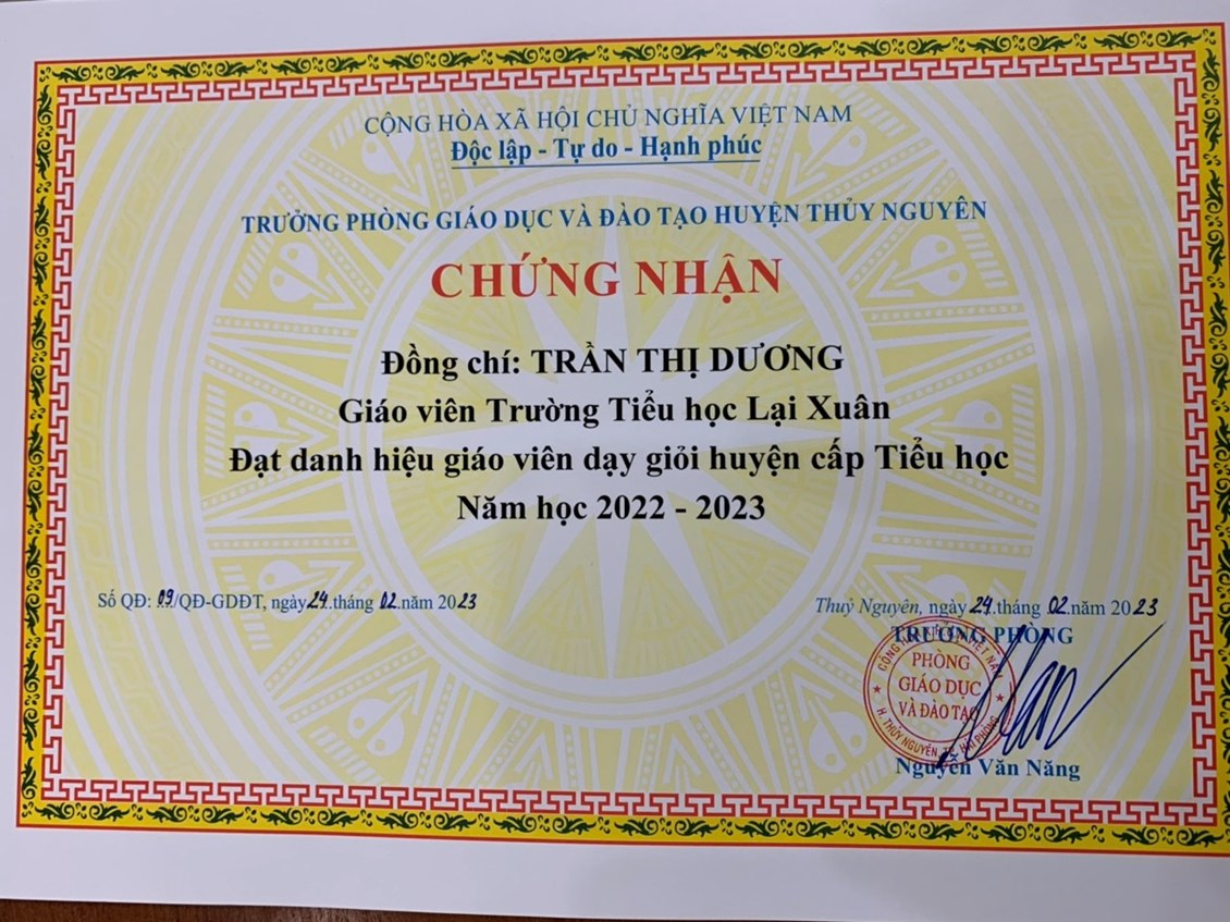 Thực hiện kế hoạch năm học của Phòng Giáo dục và đào tạo huyện Thuỷ Nguyên năm học 2022-2023 Phòng Giáo dục tổ chức cuộc thi giáo viên dạy giỏi cấp huyện. Đây là một đợt sinh hoạt chuyên môn sâu rộng của huyện nhằm giao lưu giữa các trường tiểu học trong huyện. Trường Tiểu học Lại Xuân lựa chọn 7 đồng chí tham dự đợt sinh hoạt chuyên môn này. Trải qua hai phần thi Báo cáo biện pháp nâng cao chất lượng giáo dục và thực hành tiết dạy. Kết quả 7/7 đồng chí được công nhận là giáo viên dạy giỏi cấp huyện.